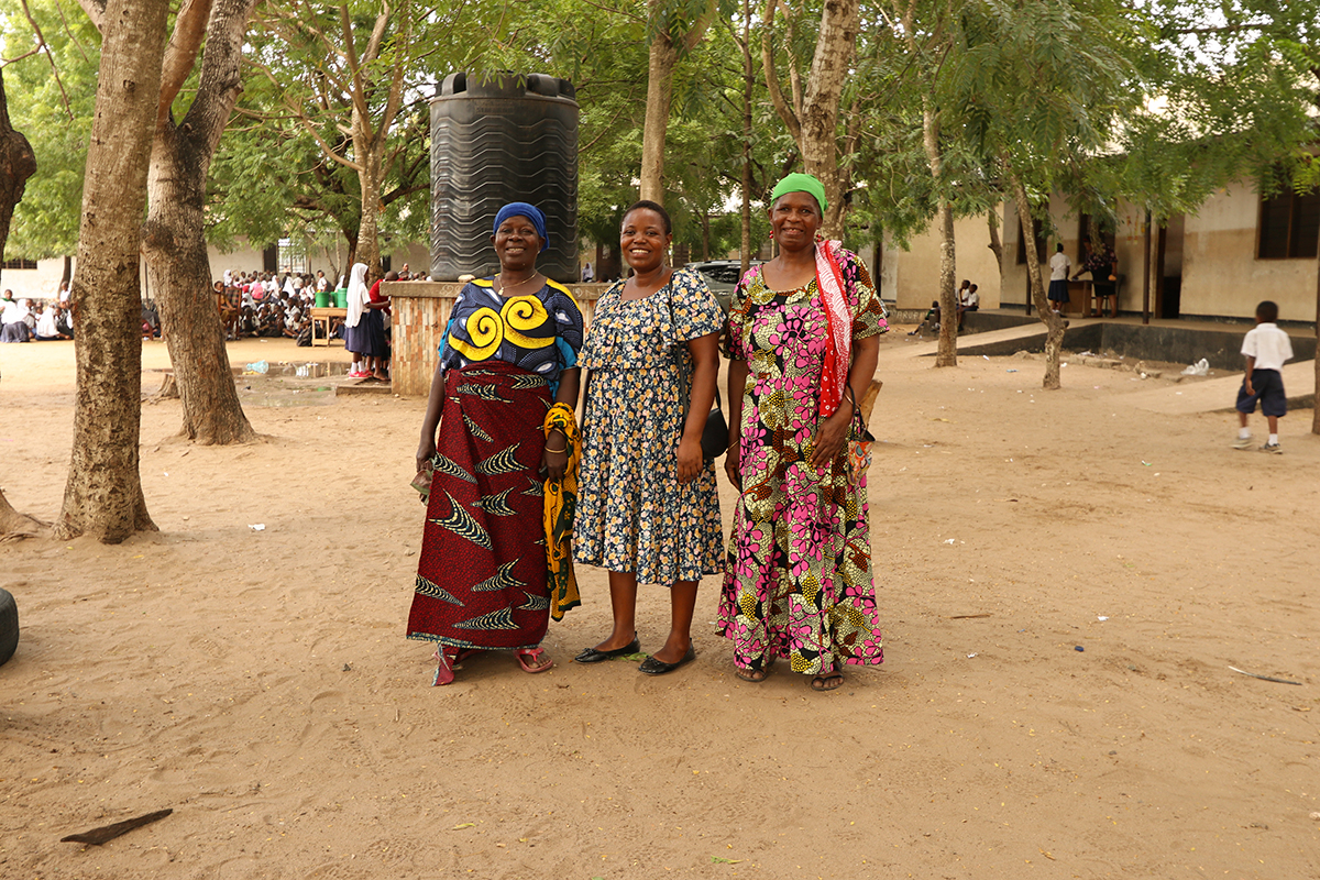 Pendo (pictured center) stands with two other Unbound mother leaders, Asia (left) and Semehi (right), in front of the water tank they installed at their children’s school with an Agents of Change grant. The initiative improved water access and sanitation for over 1,500 students at the school.