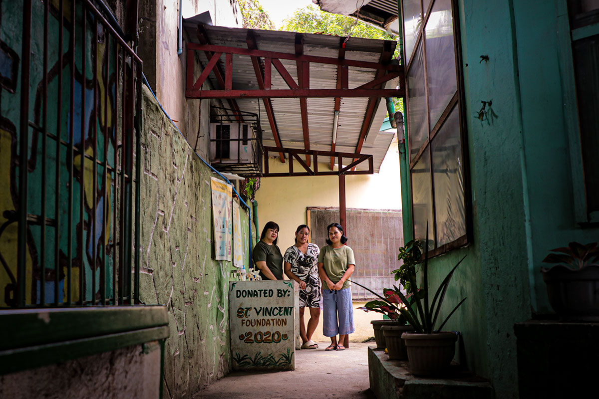 From left to right, Mary Ann, Ronalyn and Analiza were part of the Unbound mothers group that spearheaded the first Agents of Change initiative to update the handwashing stations at their children’s school in 2021. They’re standing beneath the handwashing station’s roof, which was added as part of their first initiative.