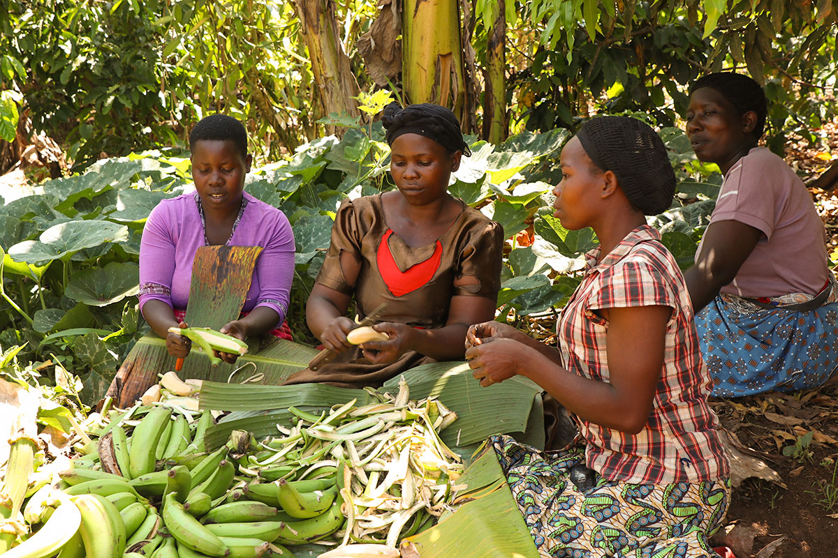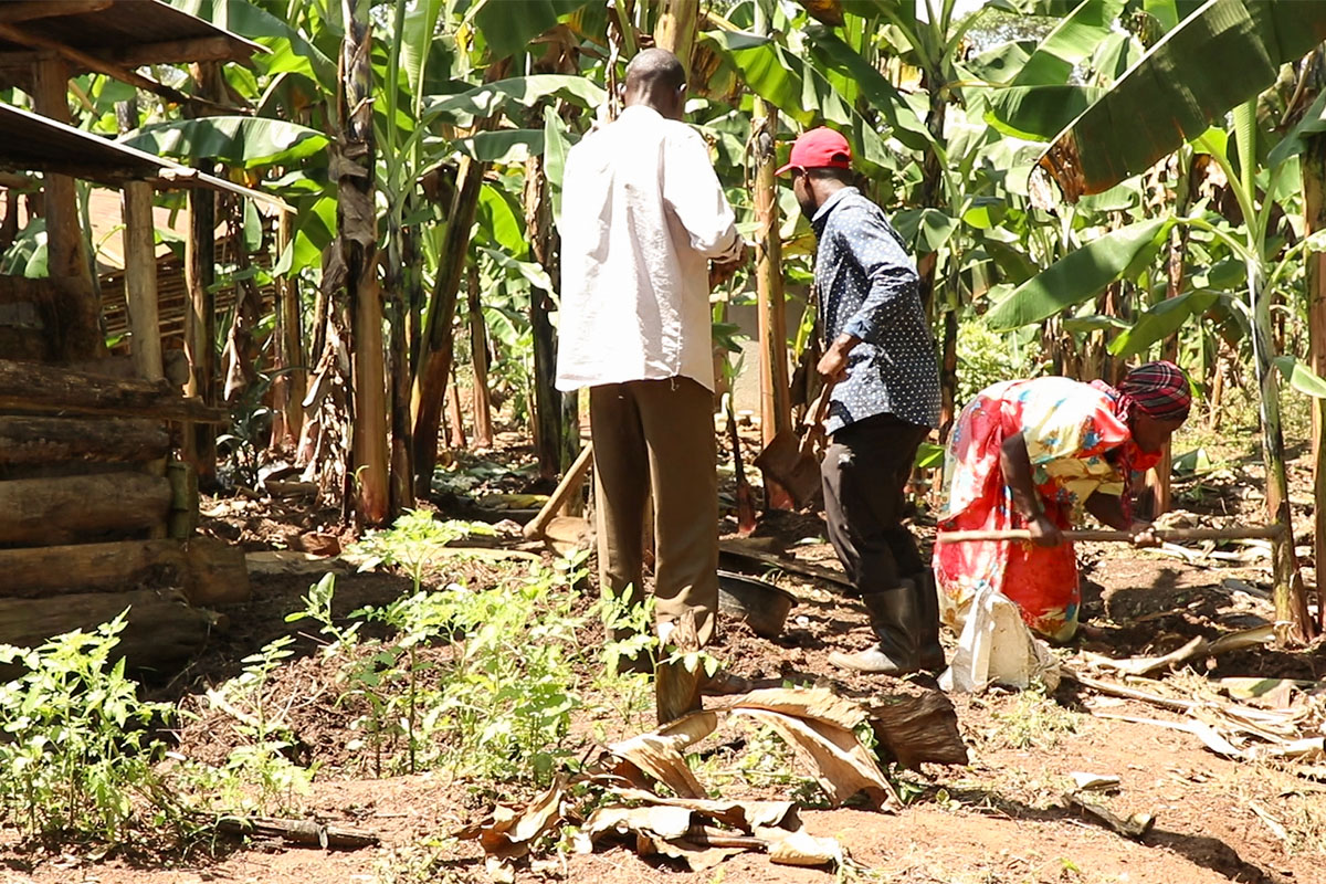 Namuddu (far right), 72, wouldn’t be able to do all the labor-intensive work to maintain her banana, vanilla and coffee crops on her farm if not for members of her small group pooling their labor and pitching in to help.