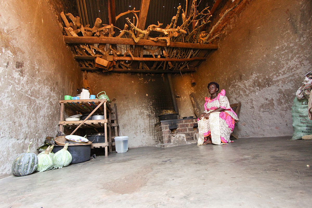 Immaculate sits inside the kitchen she improved for her family using her profits from farming. The old kitchen had grass thatch for a roof and leaked when it rained. Her goal was to save to cover the roof in iron sheets, which she accomplished.