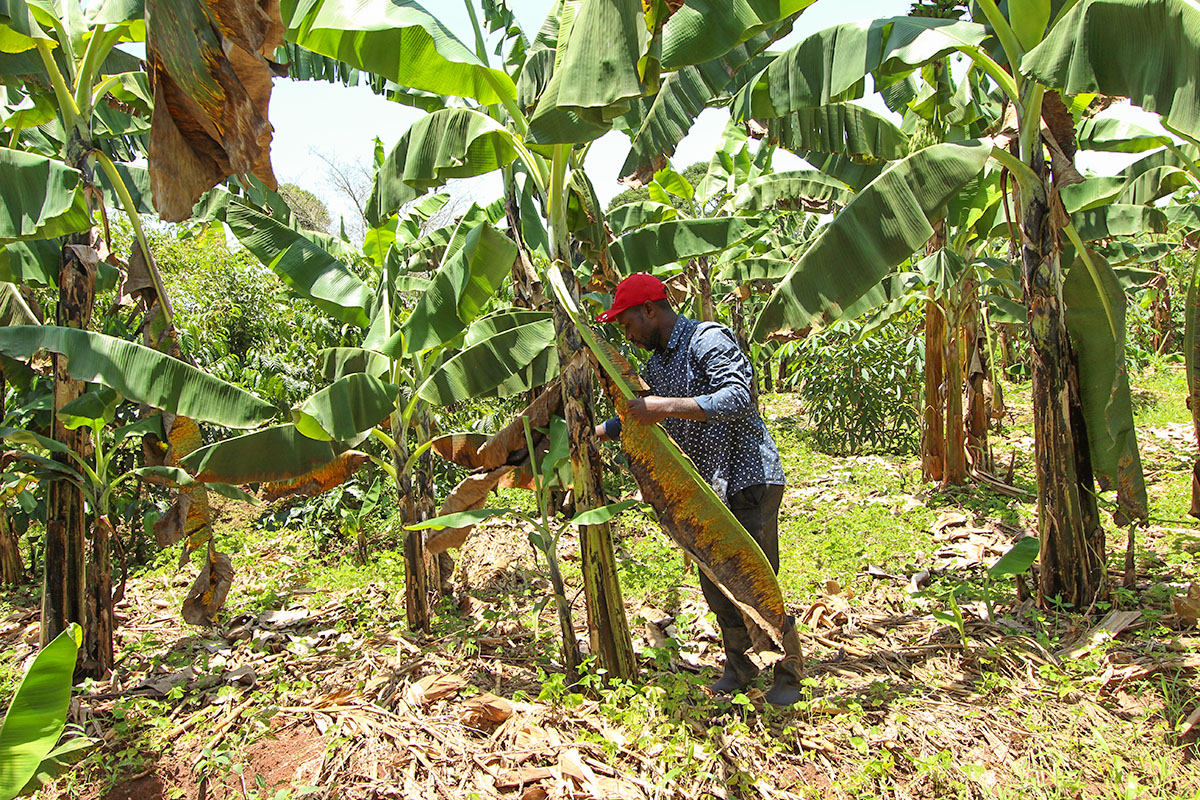 Namuddu’s son Deo, the father of sponsored child Joan, cuts down old banana leaves to use for mulching in the family’s garden, a technique he learned from the program. Namuddu's garden was chosen to be one of Kampala program's demonstration gardens.