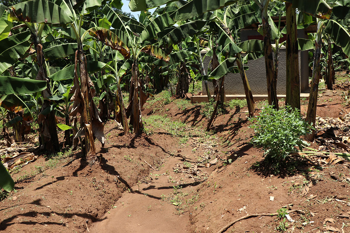 Fruit trees on a farm in Uganda line a trench dug as a climate-smart method to trap runoff water and reduce soil erosion.