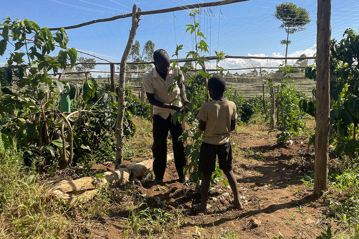 Cosmas, the father of a sponsored child in Kampala, teaches his children sustainable farming techniques he learned from the Unbound program. Cosmas grew his coffee nursery, which is one of the demonstration gardens, to become a supplier of coffee trees in his community.