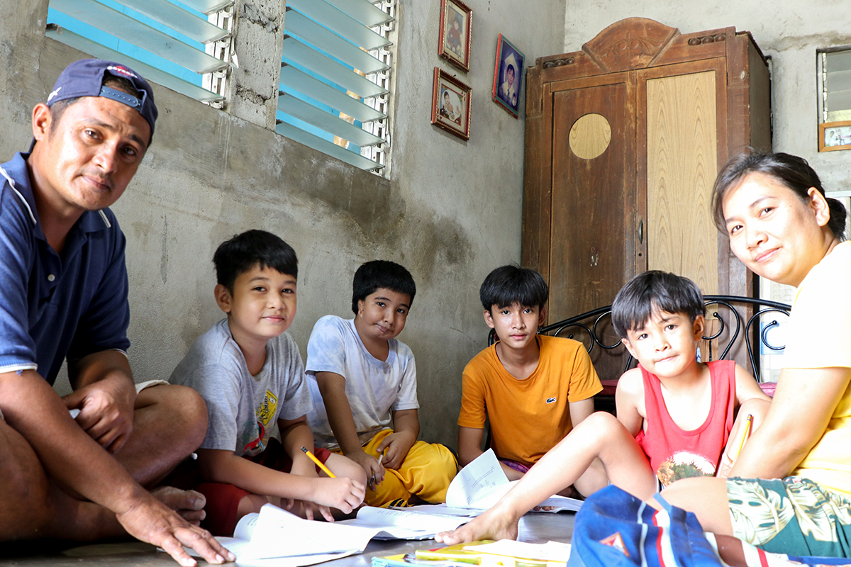Homework time is family time in the home of David, far left, and Lalaine, far right. The children are, from left, Daniel, David Jr., Josh and Rich. Josh is sponsored through Unbound.