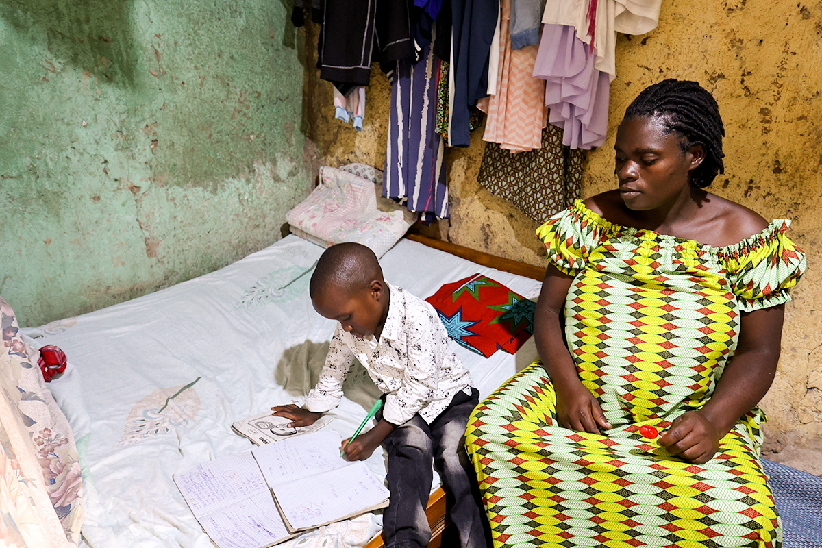 Marie supervises as son Fiston does homework. She and Felix also have a teenaged daughter and are expecting their third child soon.