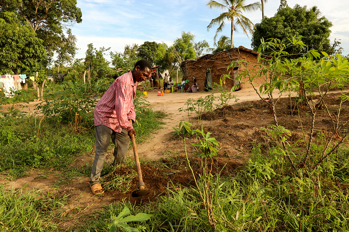 Marwa hoes a patch of land near the mud hut his family now lives in. Occasional showers soften the ground enough to work, but the lack of adequate rainfall makes it difficult. Like other East African nations, Tanzania is going through a prolonged drought.