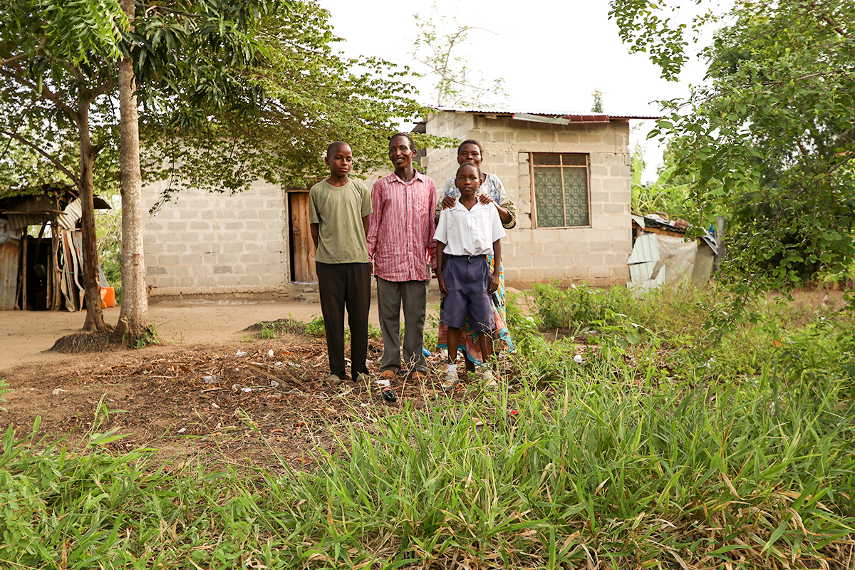 Marwa’s family stands outside the new cement block home they’re building with funds from Wambura’s sponsorship. From left are older son Bahati, Marwa and Wambura wearing his school uniform. Mother Robby stands behind Wambura.