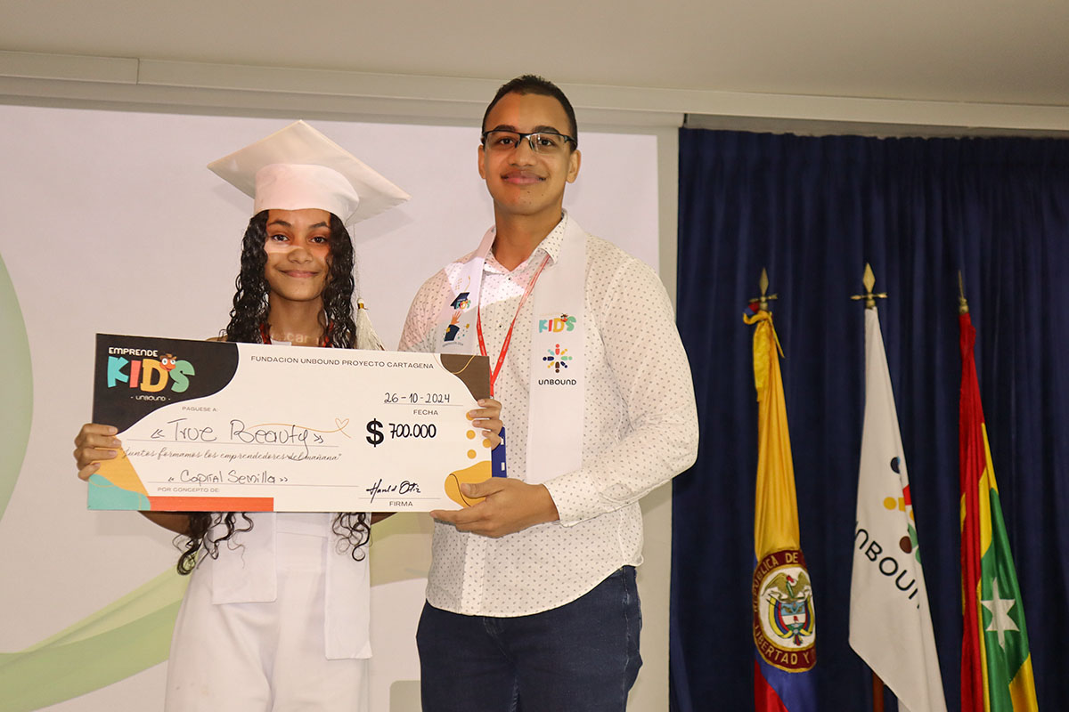 Unbound Cartagena program Coordinator Harold Ortiz awarded Emprende Kid Sol Marina, 12, the Opportunity Day grand prize seed capital of $175 USD for her beauty products business, True Beauty. (Photo submitted by Unbound Cartagena program staff)