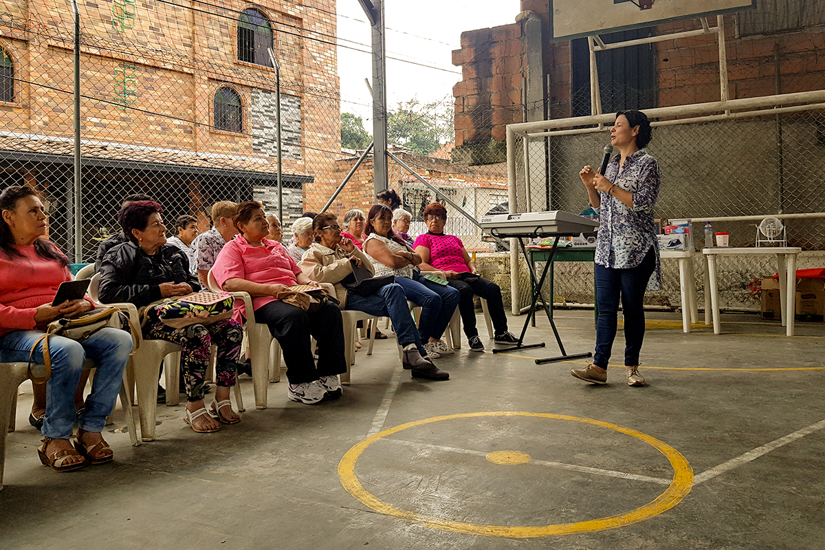 Unbound Latin America Regional Project Director Mónica Gómez talks with families in Colombia. The local staff has also been giving skills development training to families to help them qualify for and find formal jobs that offer better benefits.