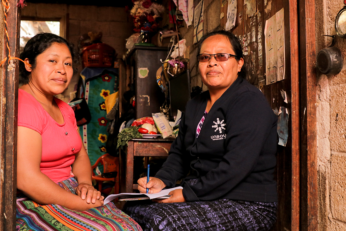 Irma (right), an Unbound social worker, pays a home visit to Nora, mother of sponsored child Cristel in Guatemala, where the family shares with Irma their troubles purchasing basic foods for weekly consumption.