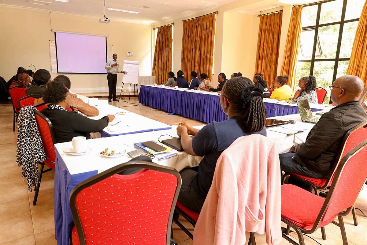 Unbound Nairobi Program Coordinator Peter Ndungo leads a meeting of program staff, the parents of sponsored children and members of a Nairobi SACCO. During the meeting, parents lamented the ways they have been forced to cope with inflation, such as skipping lunch or sending their children to informal schools that charge less tuition.