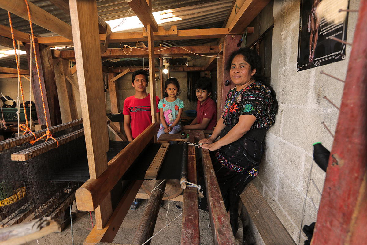 Hermenegilda operates one of the manual looms outside of the family’s home in Guatemala where she fills orders to make cuts of fabric, the livelihood that sustains her family. Hermenegilda is pictured with her children in the background, including Mario, 17, Ana, 5, and sponsored child Emiliano, 13.