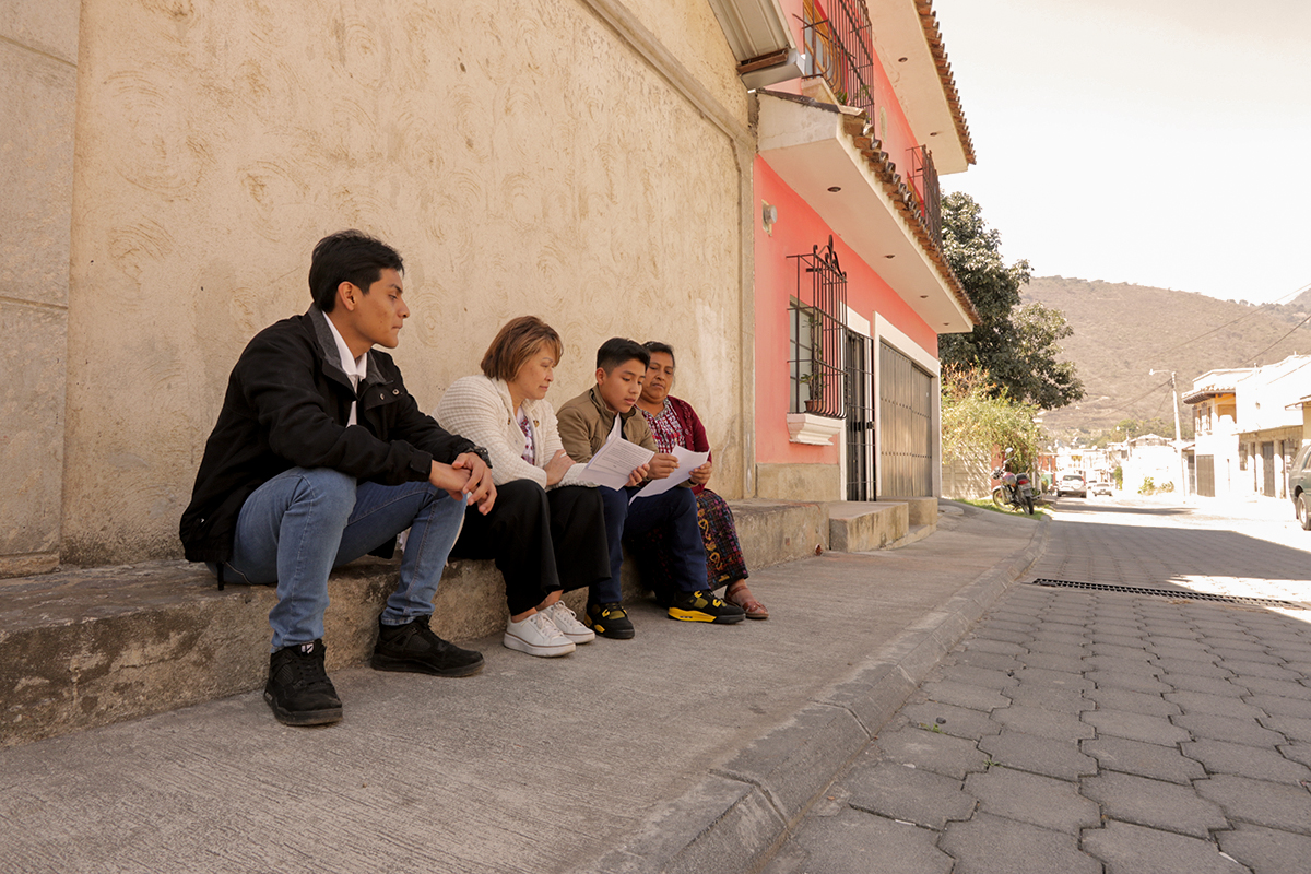 Whelan (back, center) and her husband Jay (back, right) meet with Whelan’s sponsored friends Abner, 17, and Denilson, 12, during an individual sponsor visit to Guatemala in 2024. Also pictured are Abner (front right), Denilson (center), Abner and Denilson’s mother, Marta, and two staff with Unbound Guatemala who helped coordinate the visit with the family.