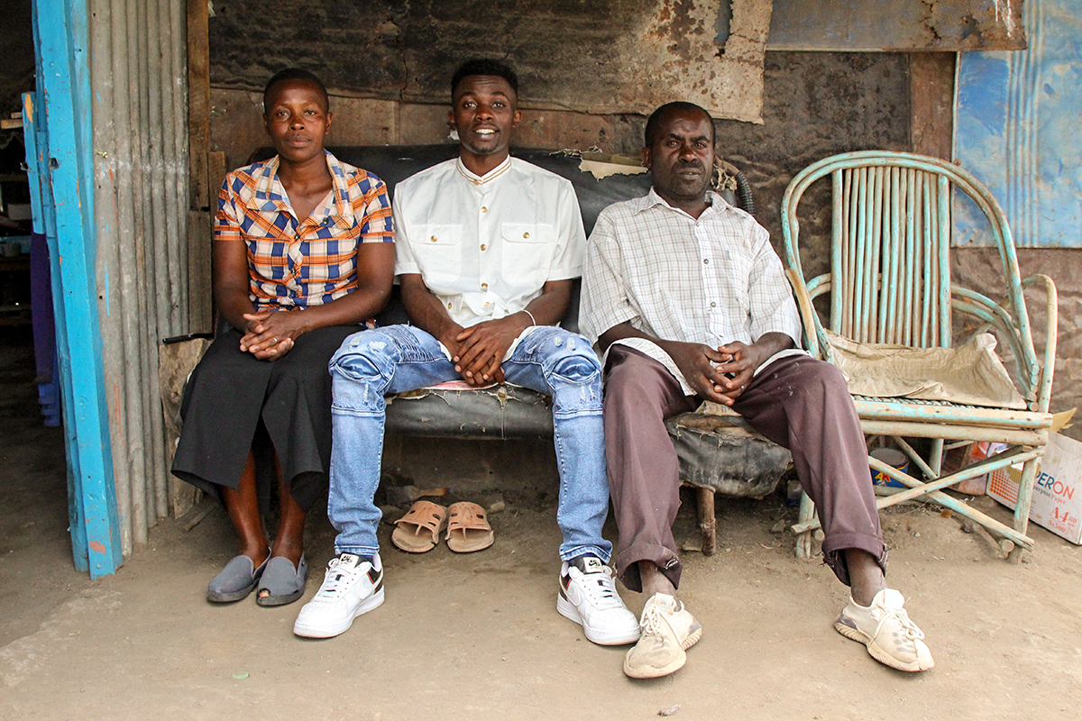 Sponsored youth and scholarship recipient Bernard (center) sits between his parents, mother, Dorcas, and father, Raphael, at their home in Nairobi where they practice farming maize and beans and raising poultry. Bernard’s sponsor also sponsors his younger sister Marceline.