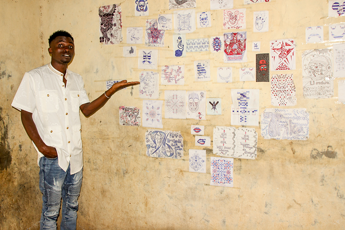 Bernard shows off his wall of hand-drawn artwork at his home in Nairobi. Bernard also performs as a comedian, going by the stage name Bena wa Malines.