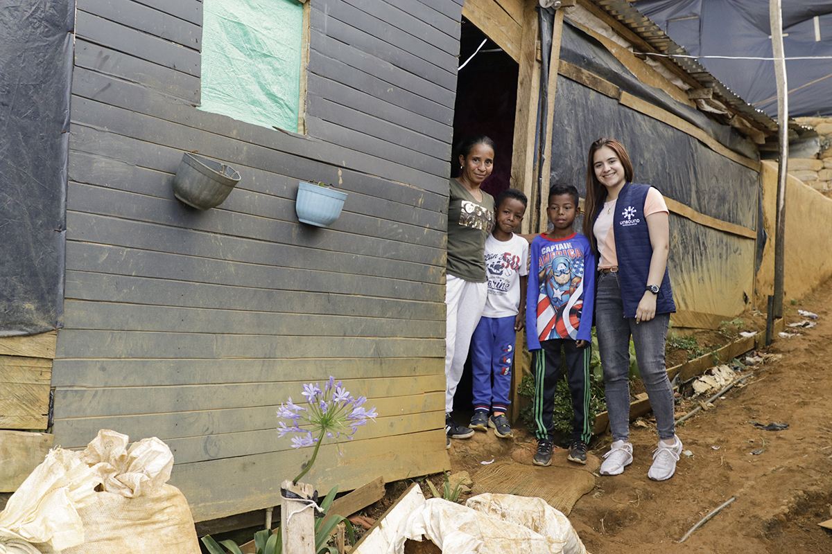Alejandra Mejía, right, a staff member in Colombia, visits the family of sponsored child Johan, standing next to her. In the doorway are Johan’s mother, Deyis, and brother Jesús. Awareness trip participants visit communities and sometimes attend home visits as an opportunity to learn more about how families live and how they’re benefiting from sponsorship.